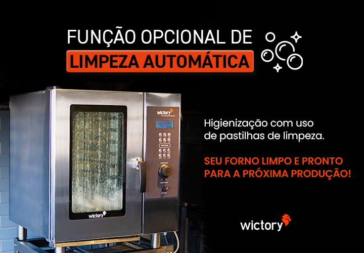 Esta função permite efetuar a higienização do forno após o uso, principalmente para retirar partes grossas de gorduras. O equipamento já é pré-programado da fábrica com tempos de aspersão de água necessários para remover sujeiras consideradas padrão dentro da realidade da maioria das cozinhas brasileiras. Opção de lavagem automática com pastilhas. Um sistema que reduz o desperdício, elimina resíduos com eficiência e mantém o equipamento pronto para o próximo ciclo, com mais segurança e produtividade.